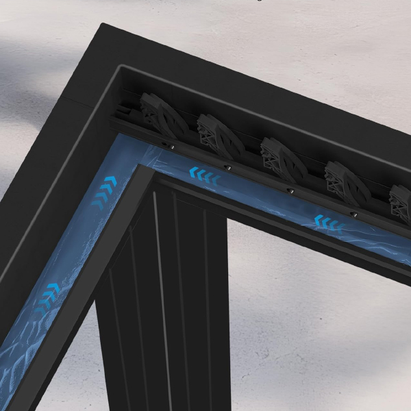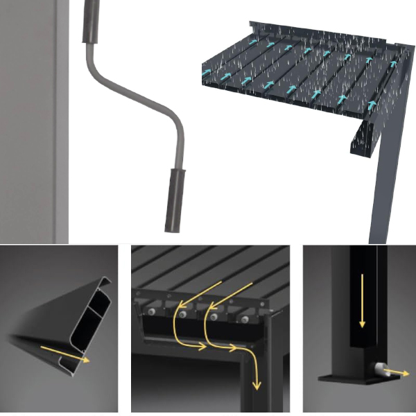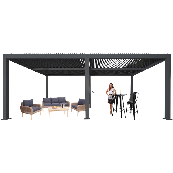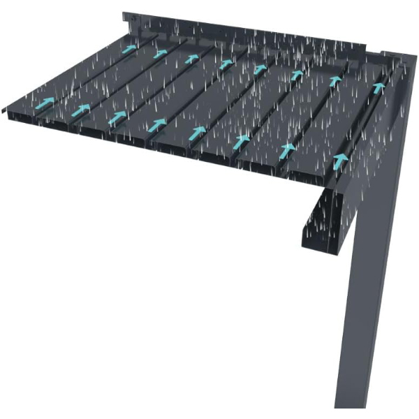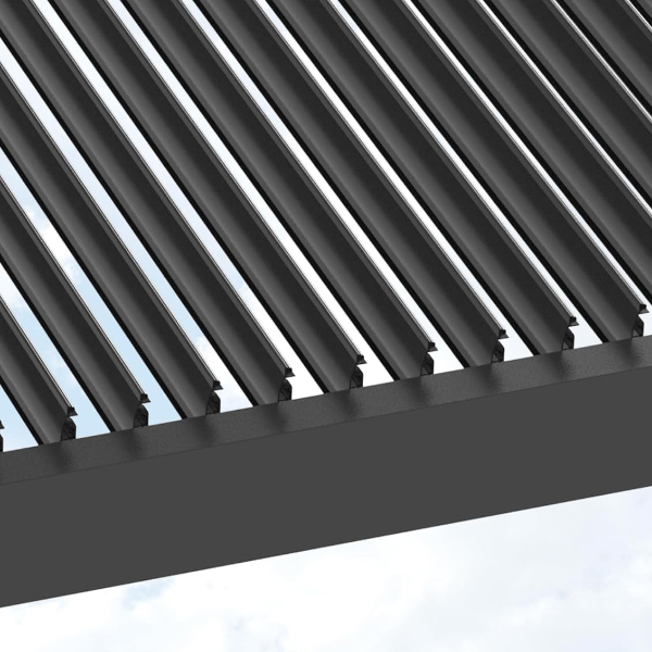 - Покрив: Регулируеми алуминиеви ламели 110x20x0.9 мм – водоустойчиви и UV защитени