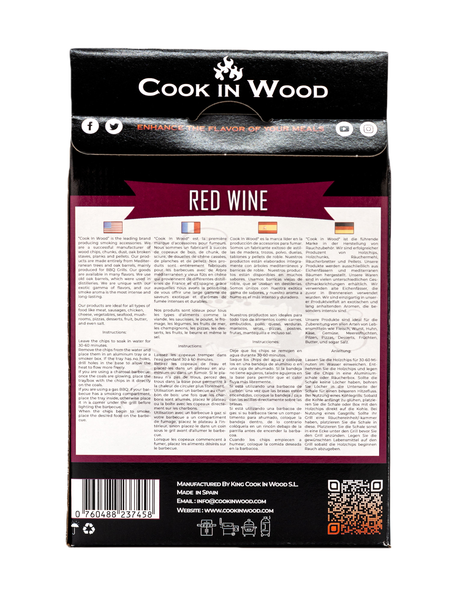 Преобразете всяко барбекю с дървените стърготини COOK IN WOOD от бъчви от червено вино, изработени от дъбови дъги, използвани за отлежаване на червено вино в Испания и Франция. Наситените винени аромати придават на месото дълбочина и елегантност, превръщайки всяко ястие в изискано кулинарно преживяване.