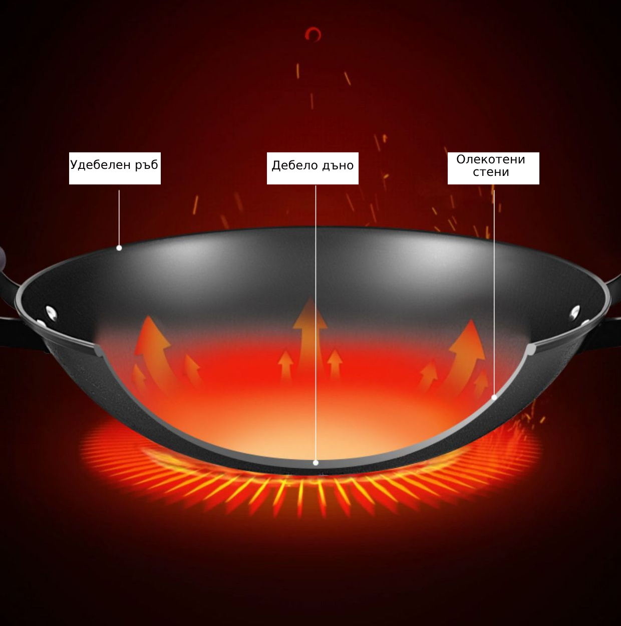 Този уок е идеален за приготвяне на разнообразни ястия, като осигурява равномерно разпределение на топлината и дълготрайна здравина. Незаменим инструмент за всяка кухня, той ще ви помогне да създадете вкусни и автентични ястия за вашето семейство и приятели.