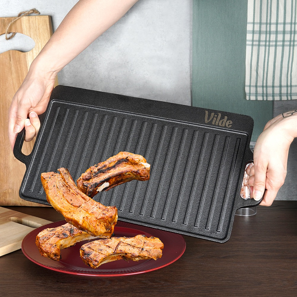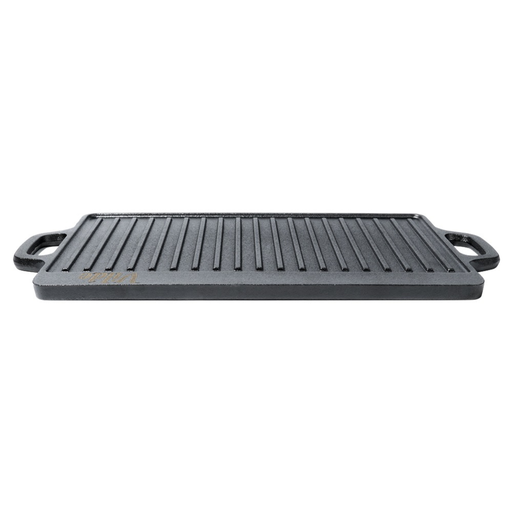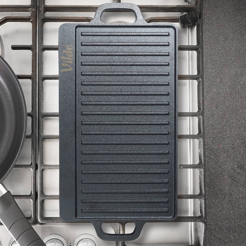 Едната страна е гладка за деликатни продукти, а другата е оребрена за класически грил ефект.