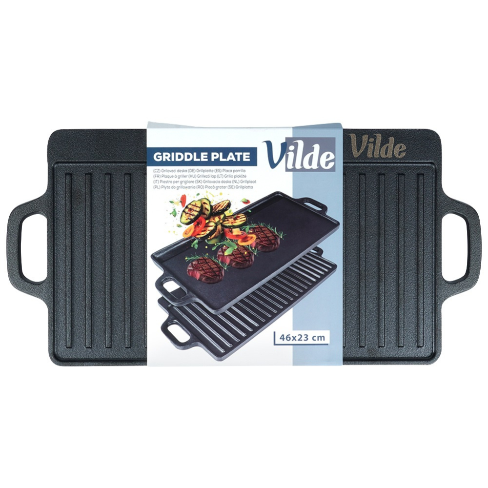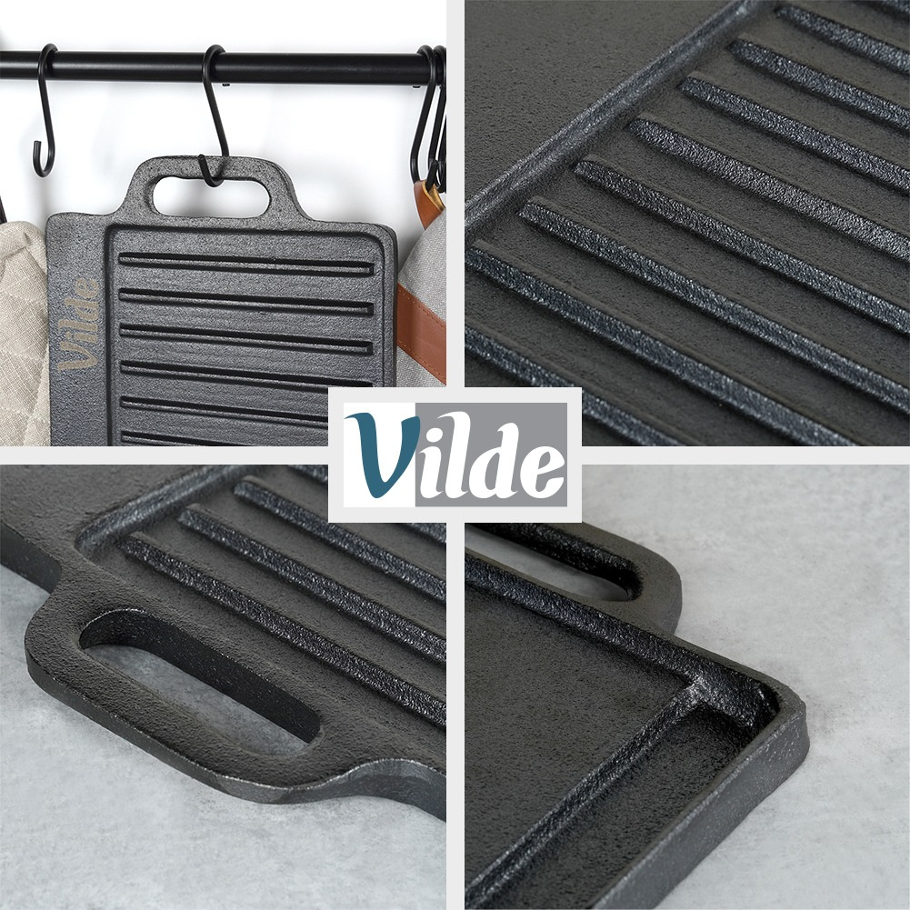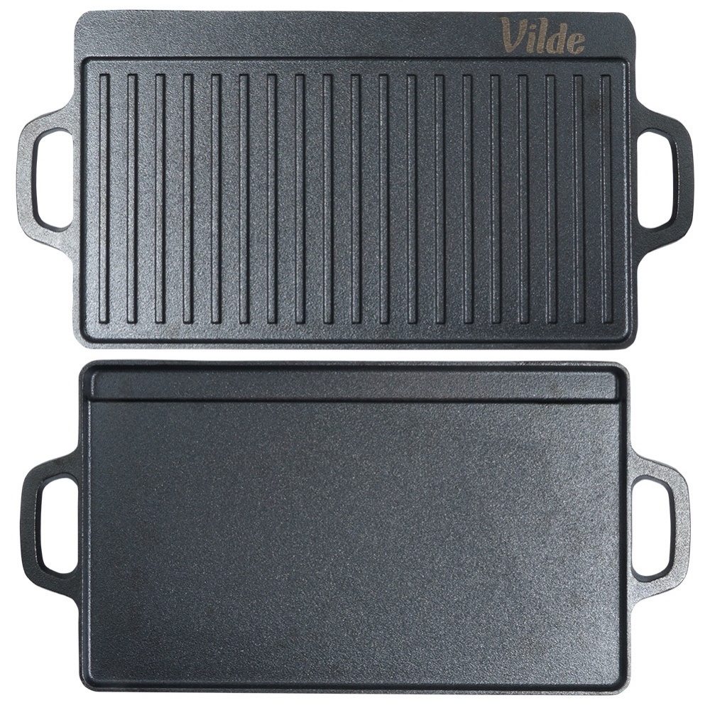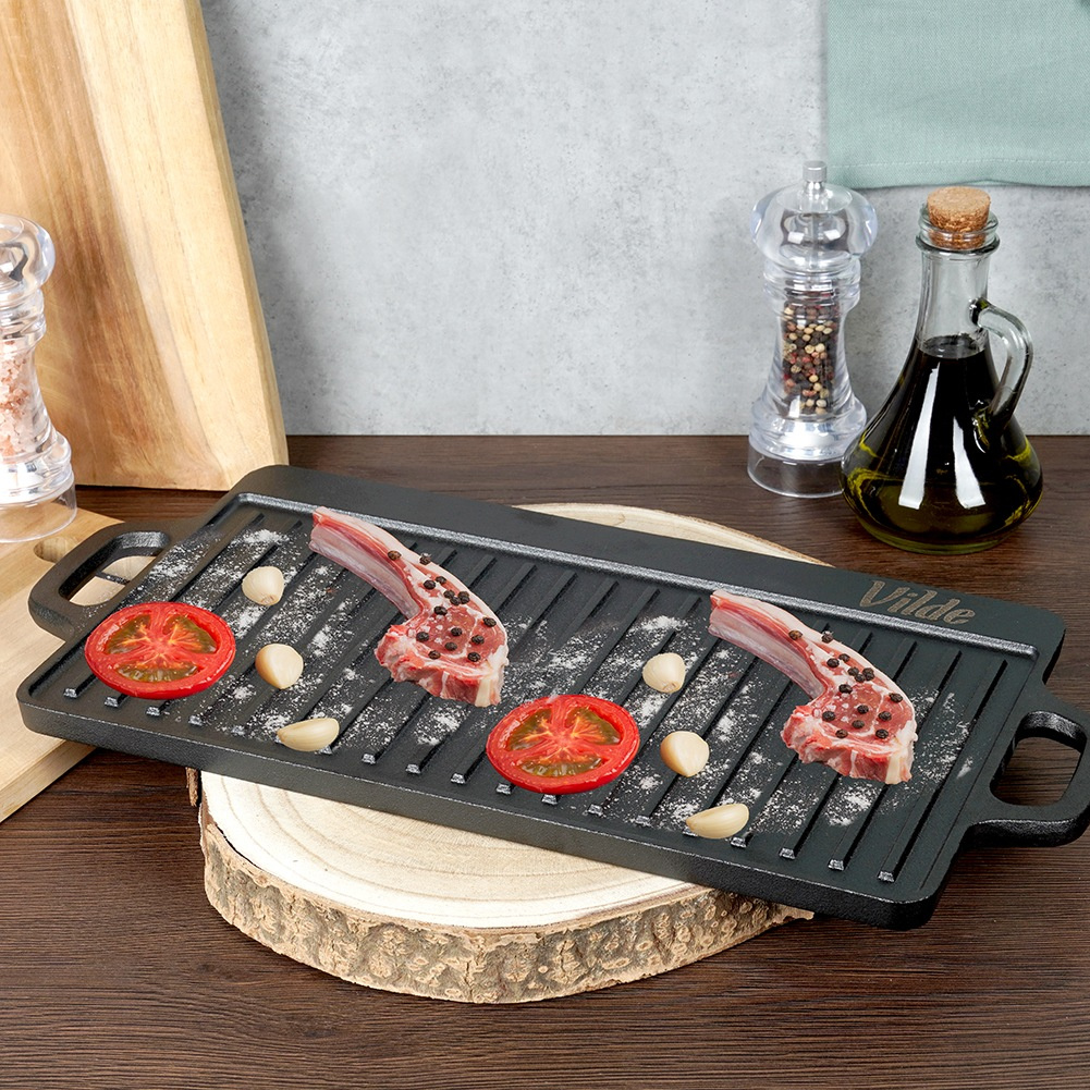 Едната страна е гладка за деликатни продукти, а другата е оребрена за класически грил ефект.