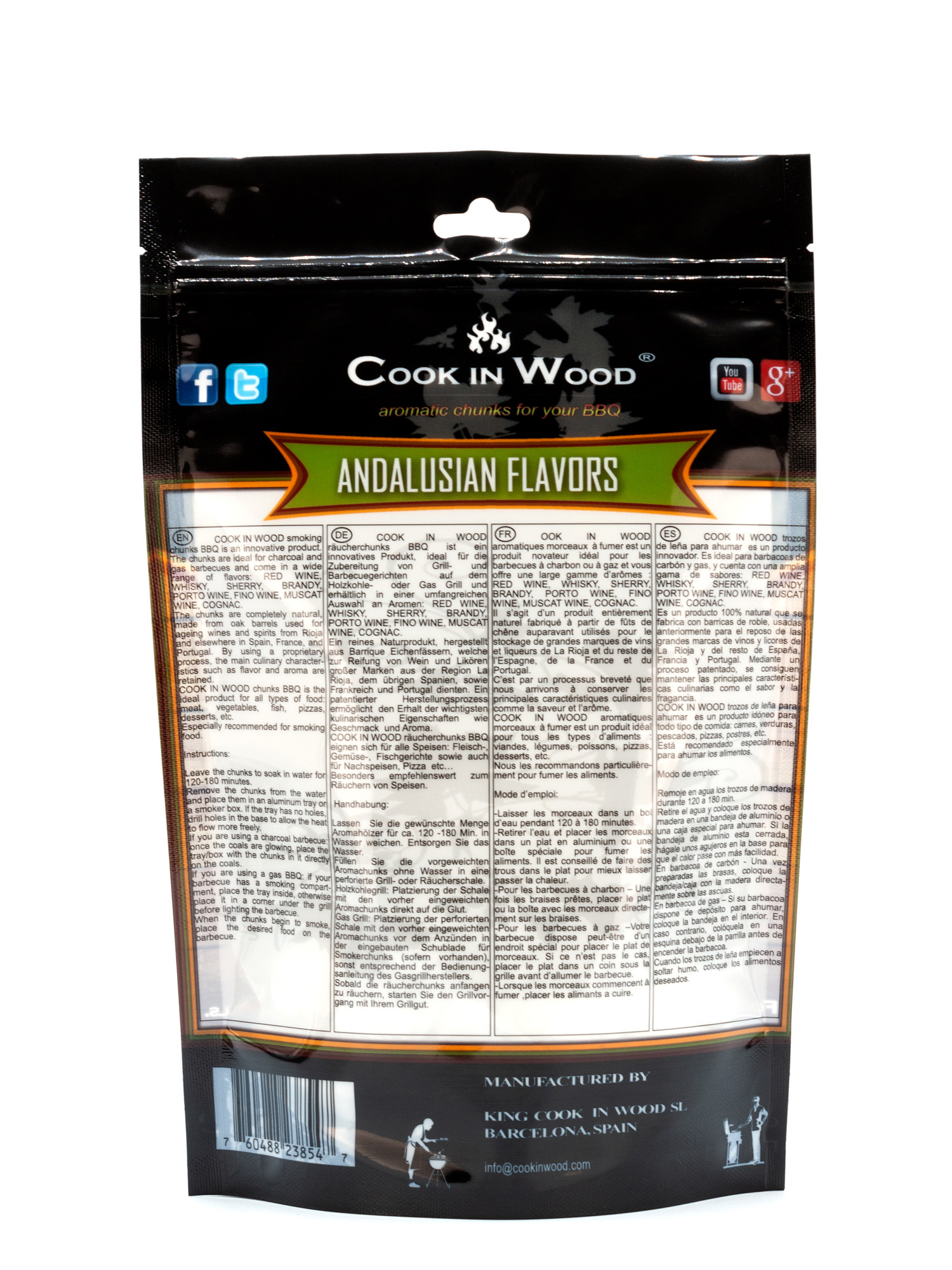 Открийте деликатното и флорално изживяване на COOK IN WOOD дървени късове от дъбови бъчви за сладко бяло вино, произведени в сърцето на Андалусия – Южна Испания. Напоени с аромата на андалусийските вина, тези късове придават на храната леко сладък, балансиран и много изтънчен опушен вкус.