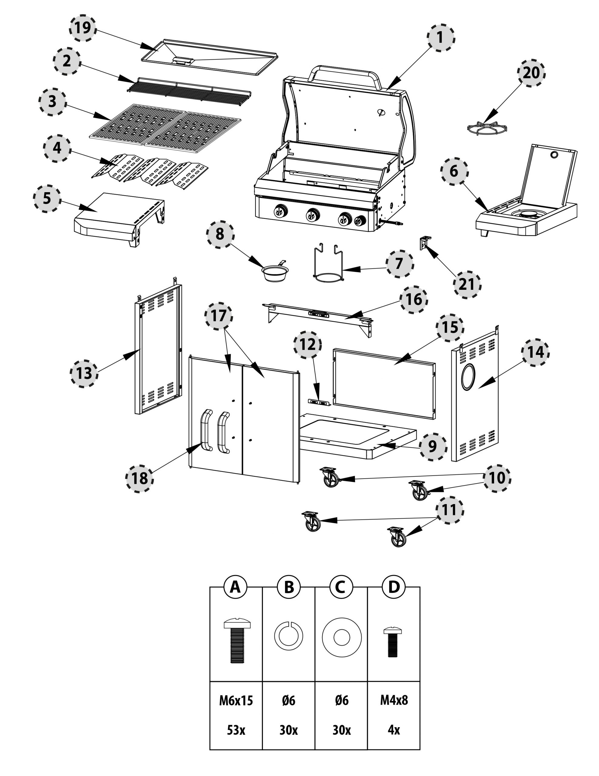 - Шкаф за съхранение: Вграденият шкаф осигурява лесен достъп и удобно съхранение на различни принадлежности за грила.