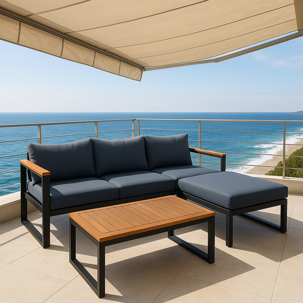 Комплектът Keane съчетава модерен индустриален дизайн с висок комфорт. Здравата алуминиева рамка гарантира дълготрайна устойчивост, а дебелите възглавници осигуряват релаксиращо изживяване дори при продължително ползване.