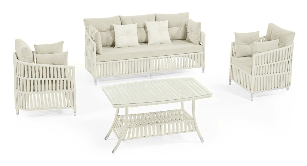 Градински мебели като MANILA CREAM създават завършен и уютен кът за отдих, в който можете да се насладите на кафе, разговори и спокойни вечери на открито. Комбинацията от диван, две кресла и масичка осигурява удобство и добра организация на пространството, без да прави компромис със стила.