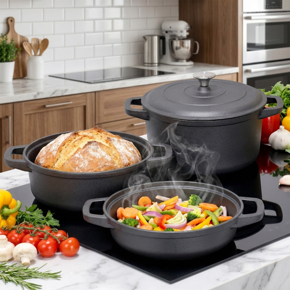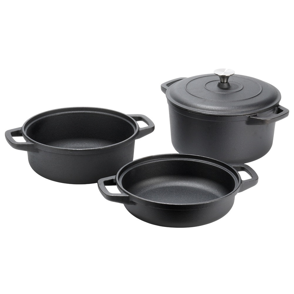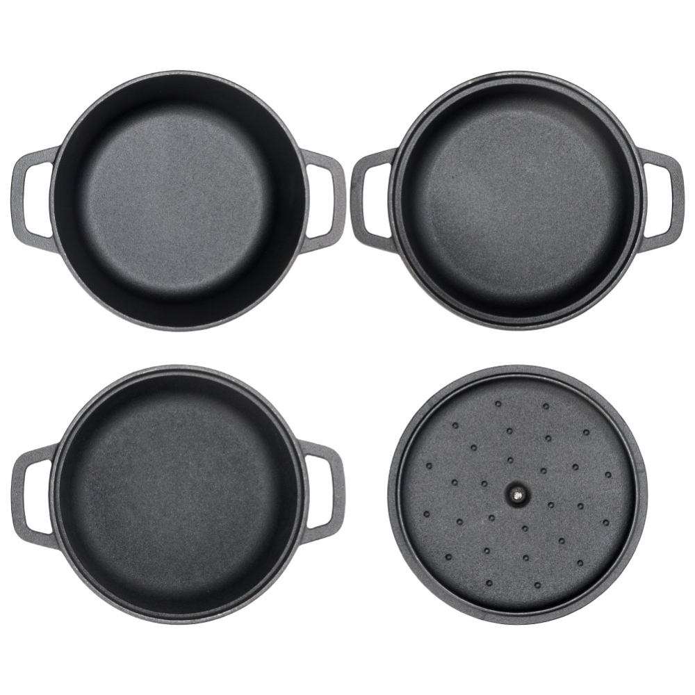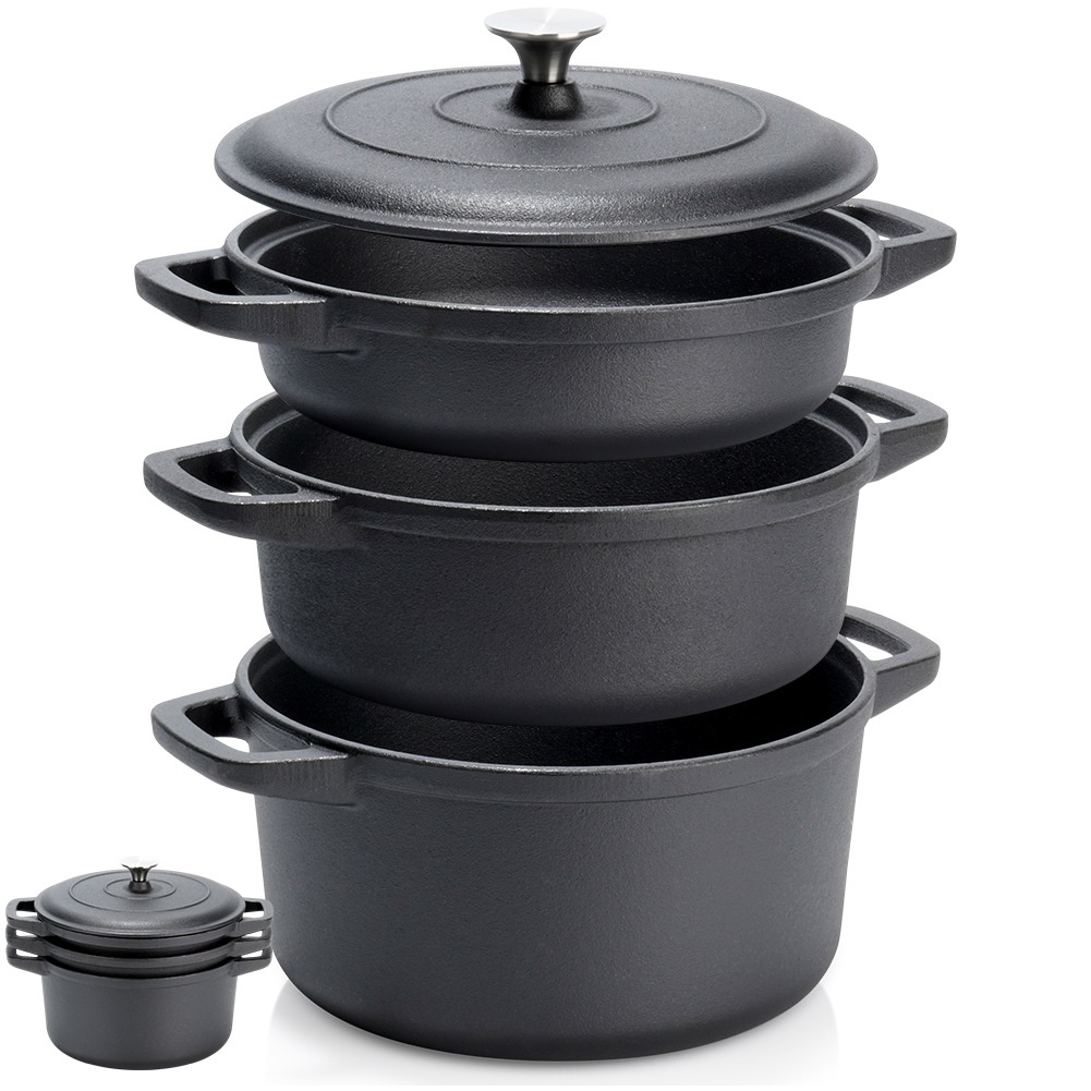 Всеки чугунен съд с капак разполага със стабилни странични дръжки за сигурно захващане и пренасяне. Масивната конструкция гарантира издръжливост и устойчивост на високи температури, което прави комплекта подходящ както за ежедневна употреба, така и за готвене на открито.
