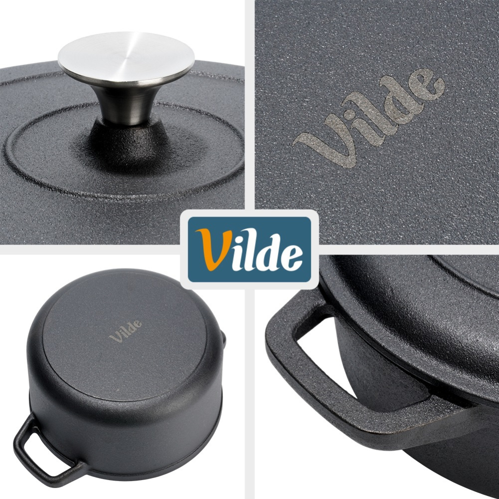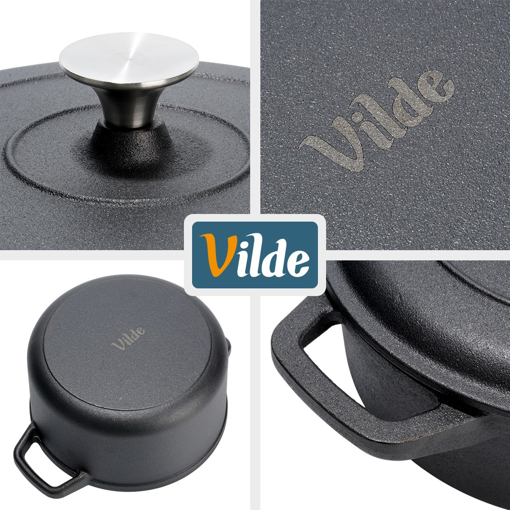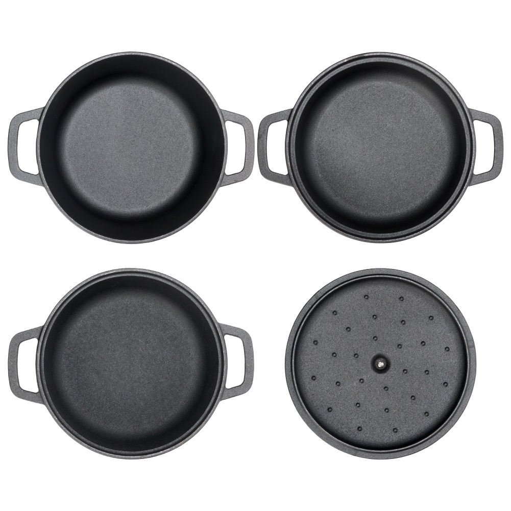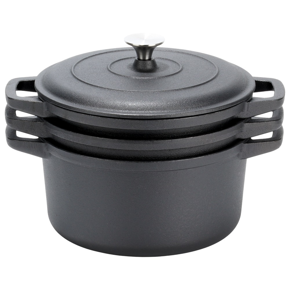 Всеки чугунен съд с капак разполага със стабилни странични дръжки за сигурно захващане и пренасяне. Масивната конструкция гарантира издръжливост и устойчивост на високи температури, което прави комплекта подходящ както за ежедневна употреба, така и за готвене на открито.