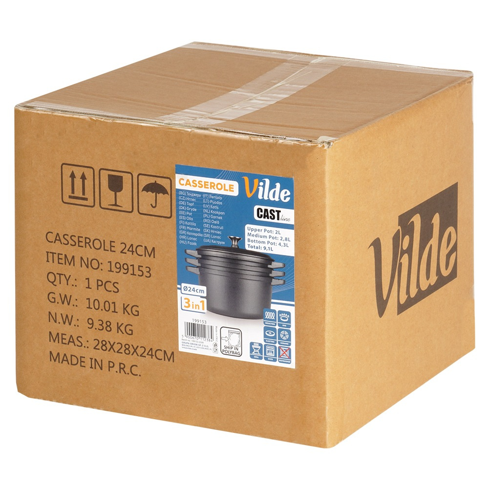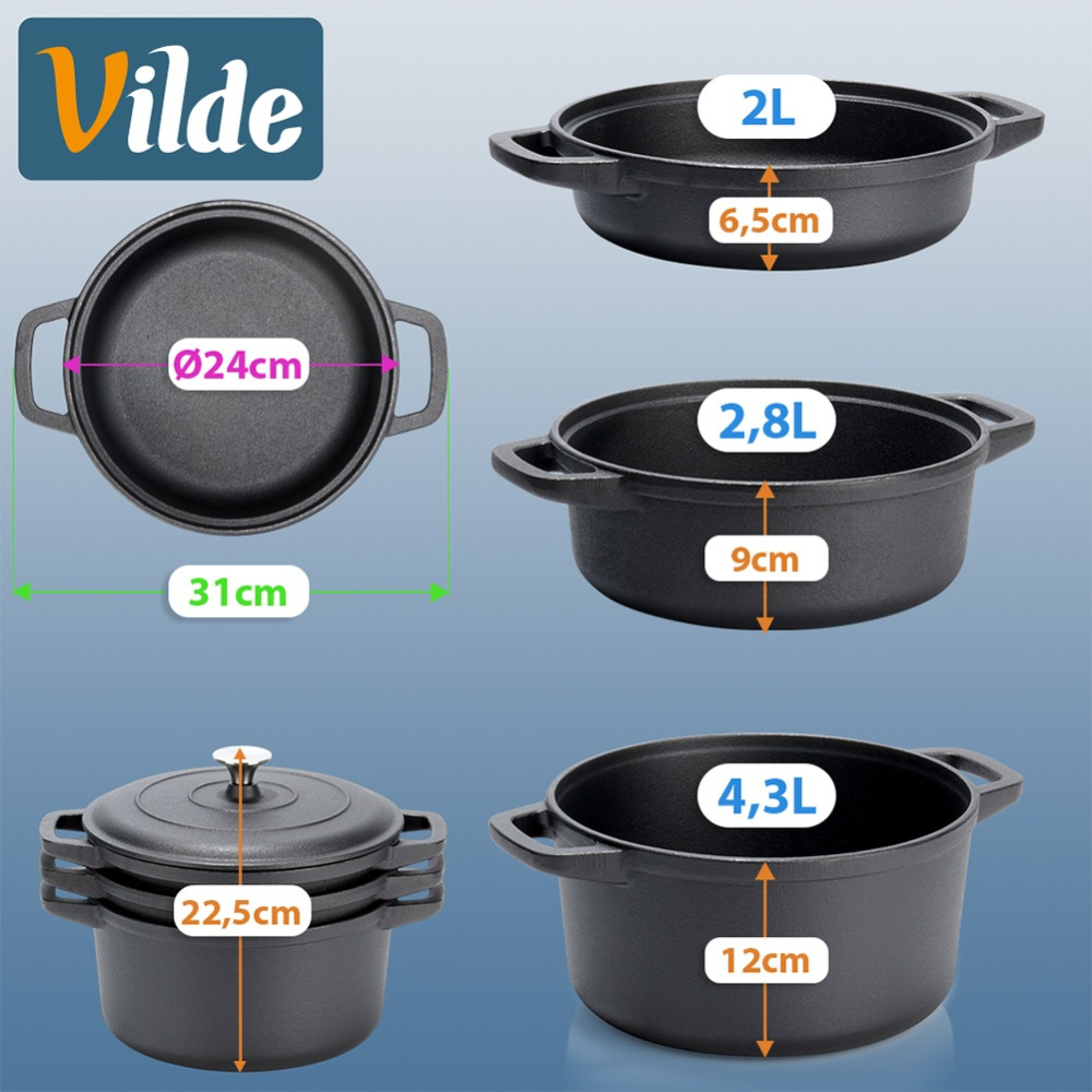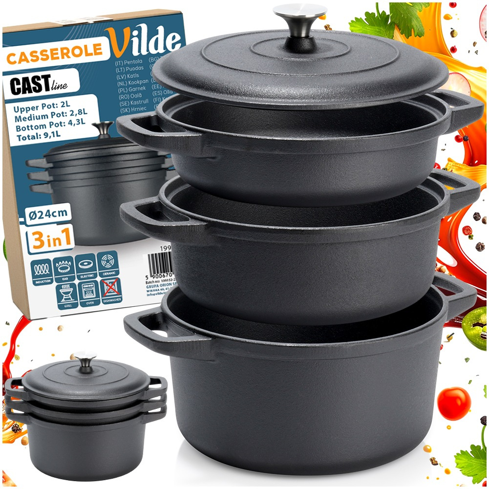 Комплект чугунени тенджери с капак 3 в 1 Ø24 см CAST LINE е практично и дълготрайно решение за всяка модерна кухня. Този чугунен комплект съдове включва три различни по обем тенджери, които могат да се използват самостоятелно или в комбинация, осигурявайки максимална гъвкавост при готвене.