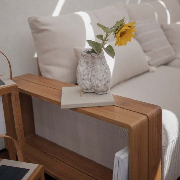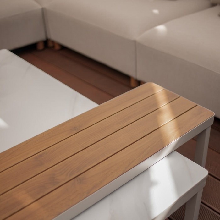 Включени са две маси с различна височина, като голямата е със синтерован камък, а малката е с алуминиев плот.