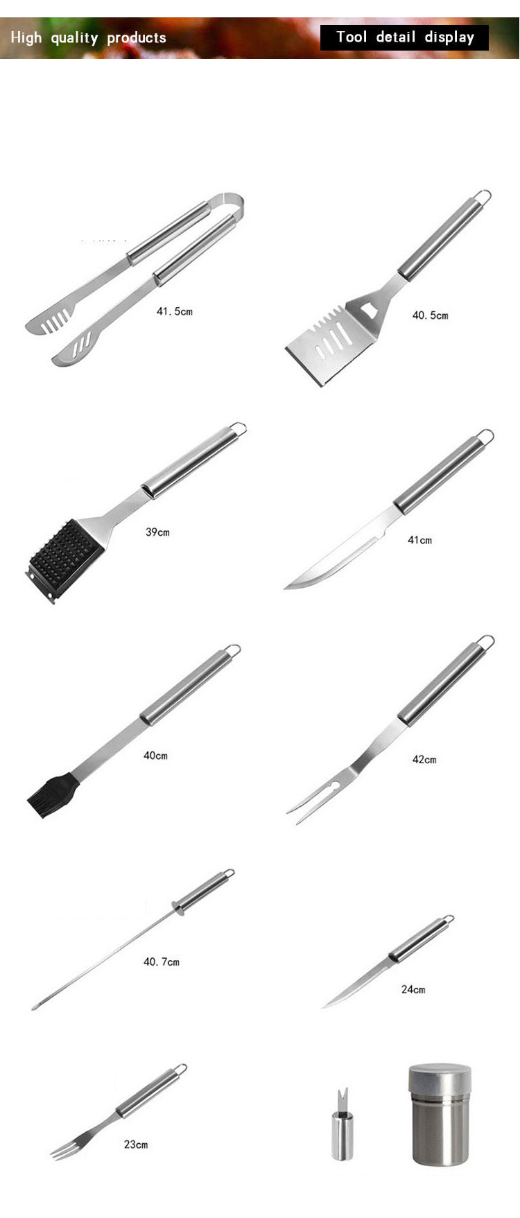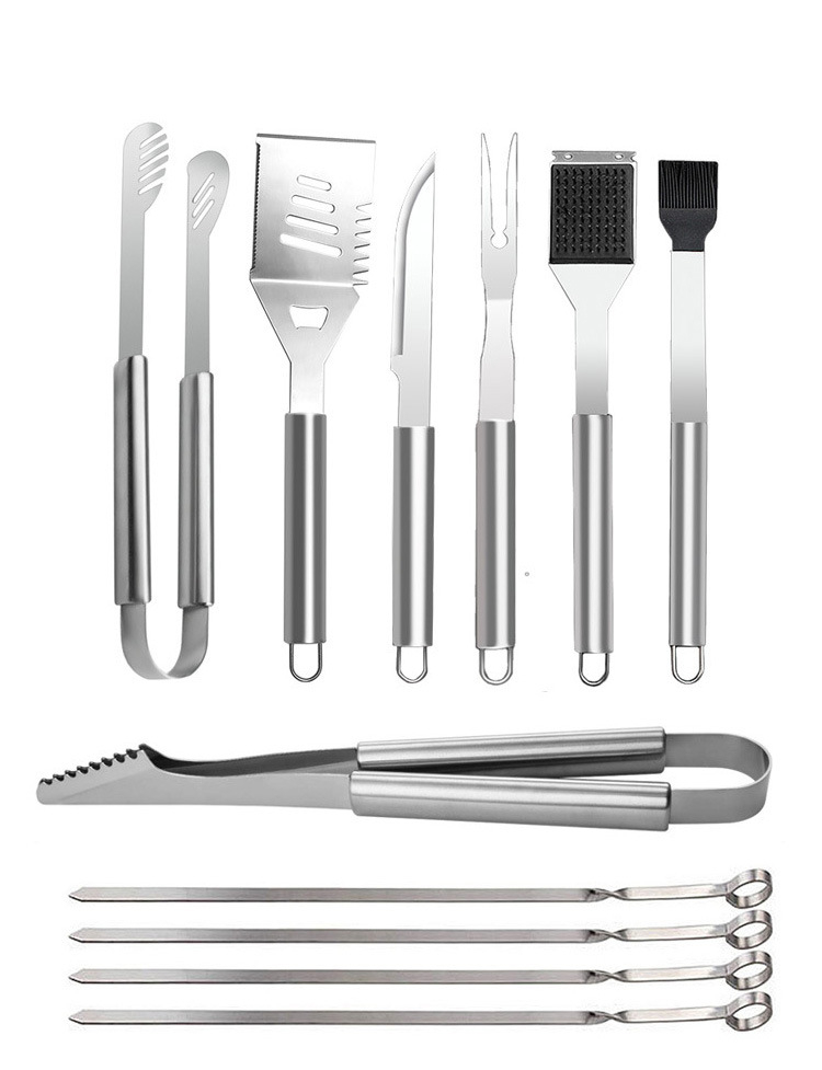 Аксесоарите са подредени в удобно куфарче, включващо солничка и пеперница, шпатула, щипка, четка за почистване, нож, силиконова четка, вилица, шишове и вилички за царевица. Този комплект ви осигурява всичко необходимо за успешно барбекю, където и да сте, и впечатлява с удобство и стил.