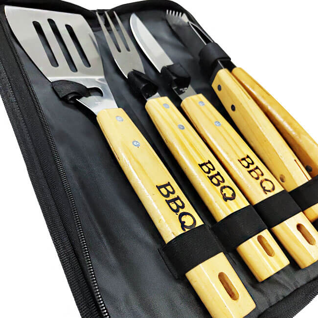 Всички прибори са събрани в текстилен плик, което го прави идеален за лесно съхранение и транспортиране. Пликът е компактен и практичен за барбекю в градината, на плажа или при излети.