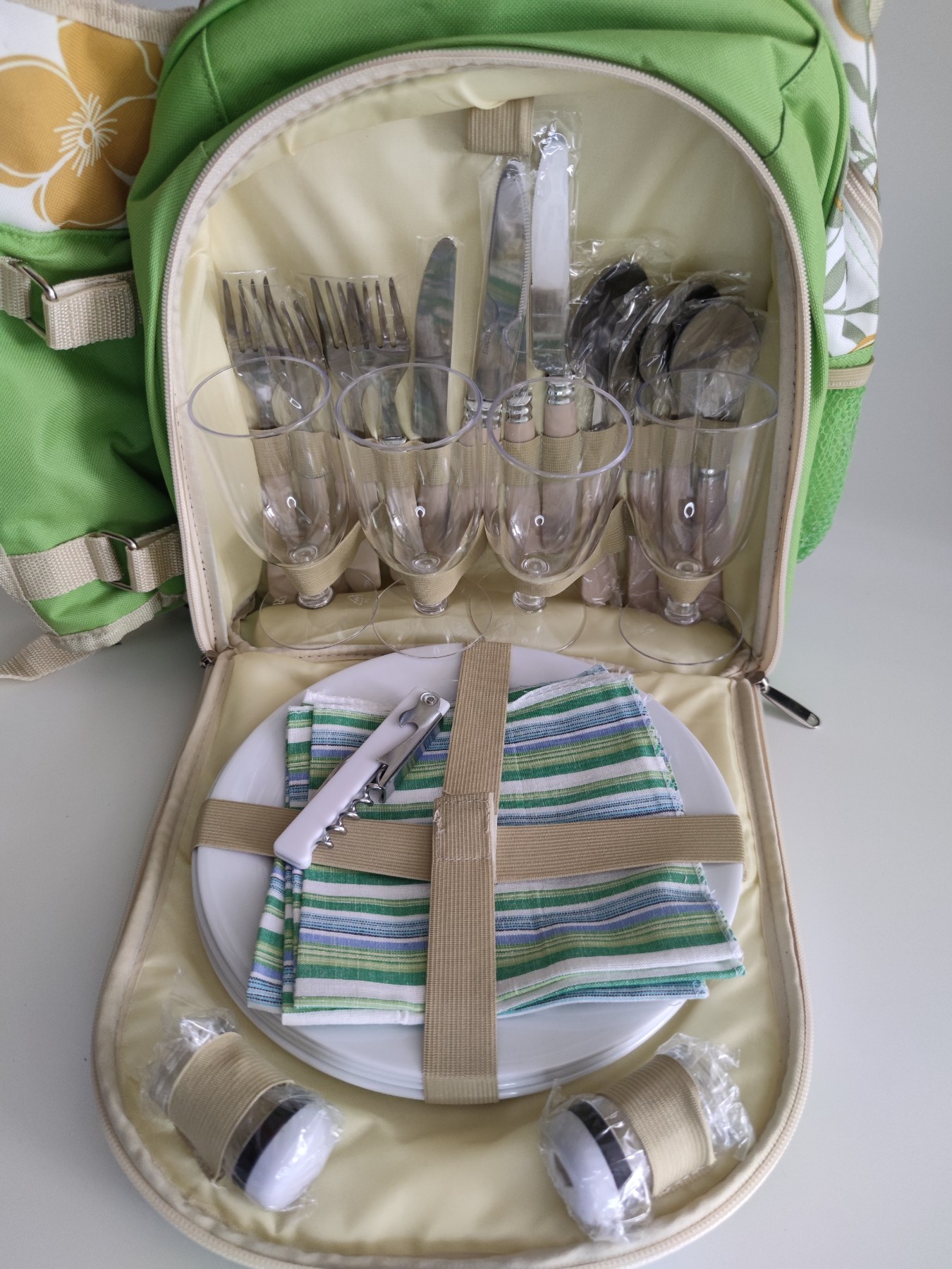 Подгответе се за чудесен ден на открито с раница за пикник "Цветя" за 4-ма. Този практичен комплект в зелен цвят предоставя всичко необходимо за уютен пикник в природата.